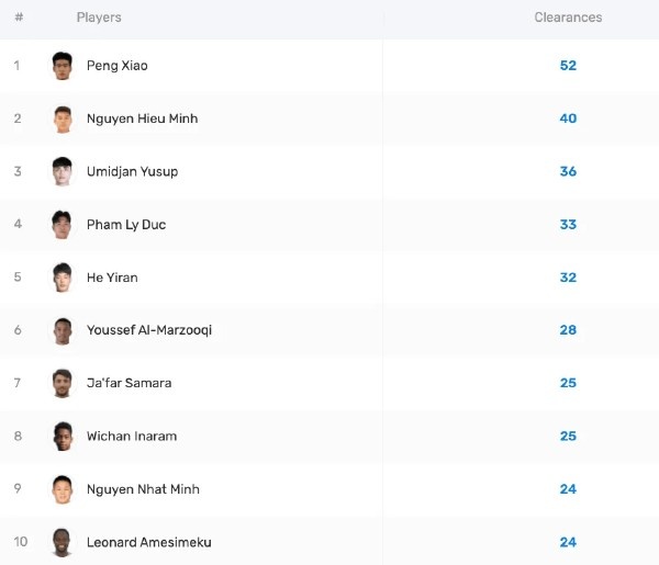 从榜单上可以看到,踢了5场的彭啸贡献了52次解围,领先第二名12次,比队友吾米提江多出了16次。