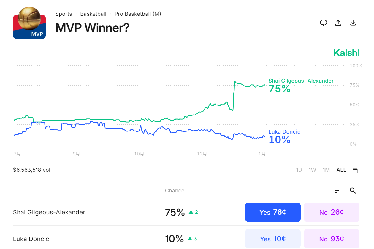 这场比赛后SGA的MVP概率从72%提升到75%,SGA的MVP概率已经断崖领先,约基奇仅剩10%而且约基奇没有复出的日期表,所以SGA卫冕MVP似乎已经确定。
